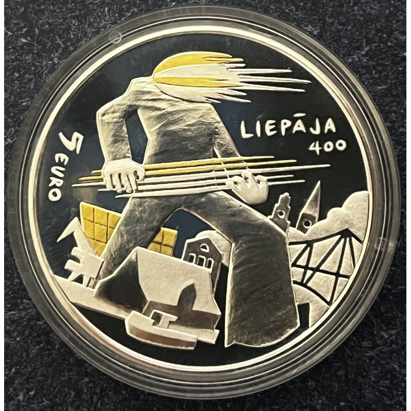 El anverso de la moneda presenta un diseño con diferentes intensidades de escarchado y dorado. Representa al viento, un roquero impetuoso, azotando los tejados de la ciudad. El fondo muestra elementos icónicos de Liepāja: el puerto, un barco pesquero, la sala de conciertos "Liepājas Dzintars", el puente Oskars Kalpaks sobre el canal de Karosta, las agujas de las iglesias y los edificios de la ciudad. A la izquierda, la inscripción "5 euros" se encuentra en semicírculo; a la derecha, la inscripción "LIEPĀJA 400" se dispone en dos líneas.