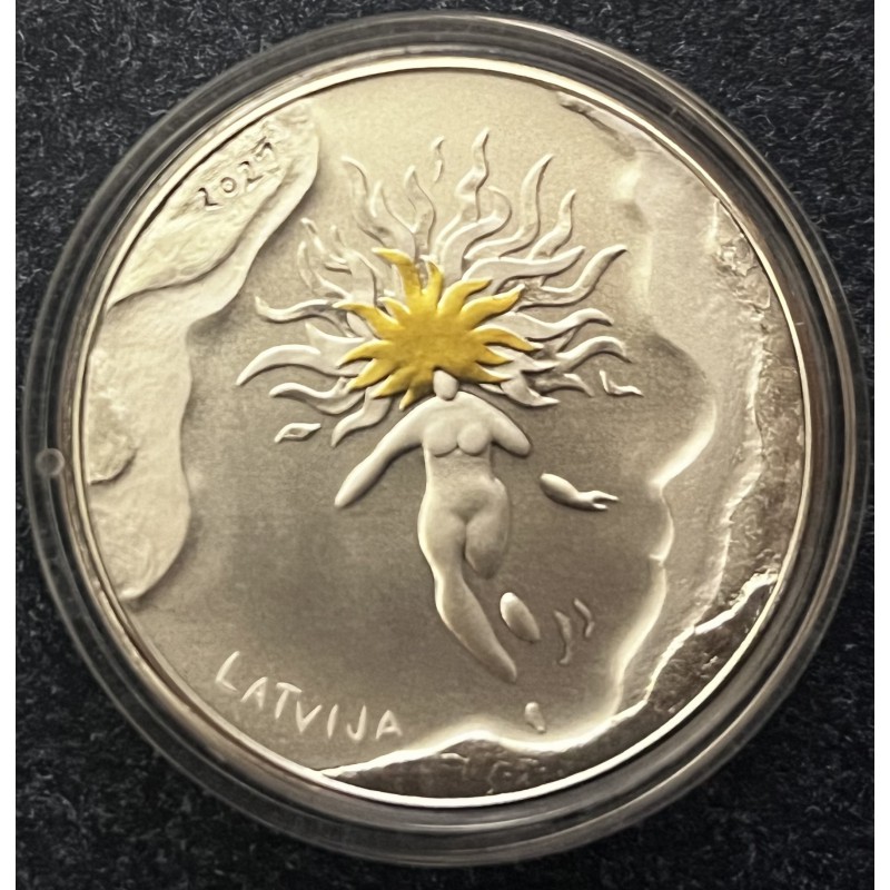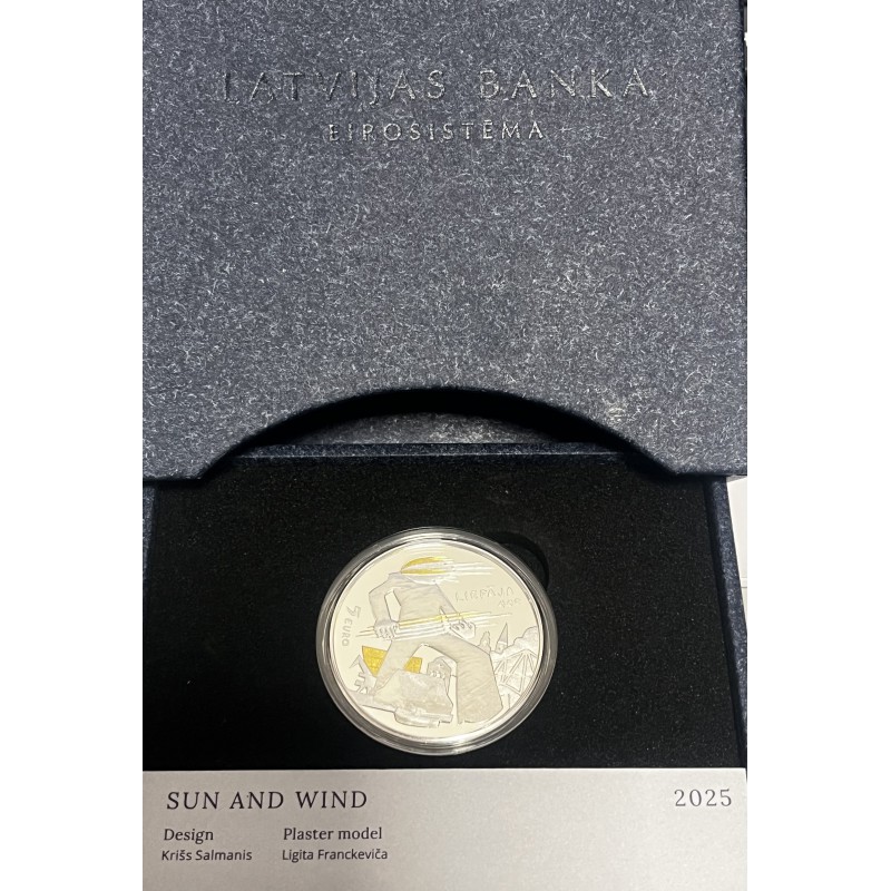 El reverso de la moneda presenta un diseño con diferentes intensidades de escarchado y dorado. Muestra el Sol: una mujer bañándose tranquilamente en el mar, con su cabello ondeando en el agua como brillantes rayos de sol. El año «2025» se encuentra en la esquina superior izquierda, y la inscripción «LATVIJA» forma un arco semicircular en el borde inferior izquierdo.