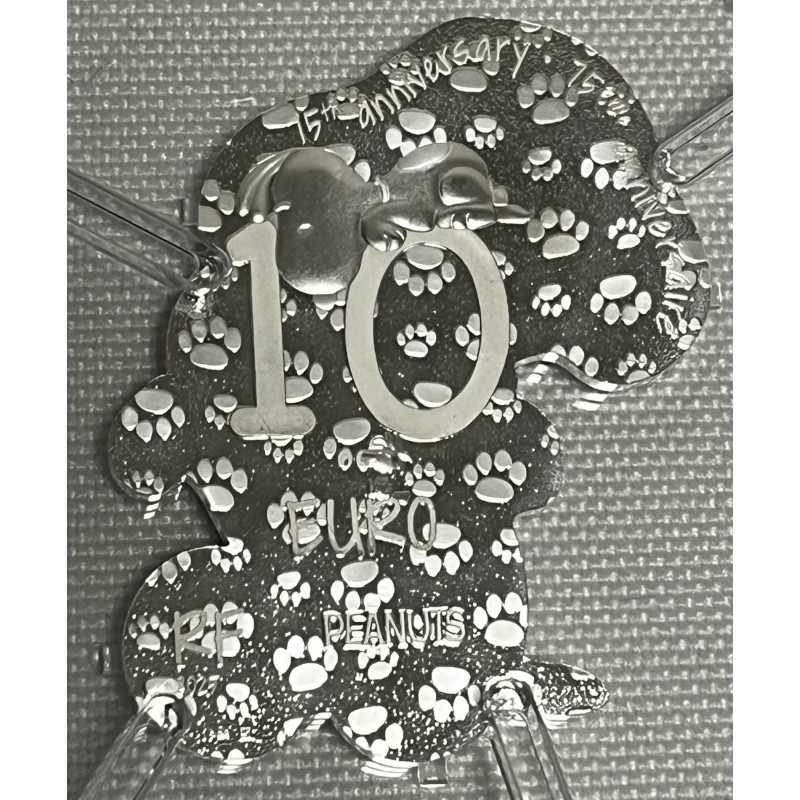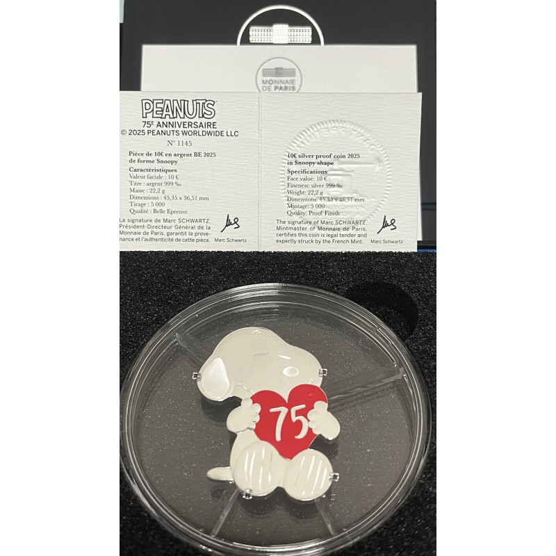 El Anverso de esta moneda con forma muestra a Snoopy en una de sus poses más icónicas. Sentado y sonriendo de forma cariñosa mientras sujeta un corazón en cuyo centro se encuentra grabado el número 75 en referencia a su aniversario. El Reverso de la moneda muestra, sobre un fondo de huellas de perros, al personaje acurrucado sobre las siglas "10" del valor facial y mirando fijamente a su diminuto amigo. Las inscripciones "75th ANNIVERSARY - 75eme ANNIVERSAIRE" ocupan la parte superior, en la parte inferior se aprecia las siglas RF. Moneda en Plata 999% con una tirada de 5.000 unidades acompañada de su correspondiente estuche y certificado de garantía y autenticidad.