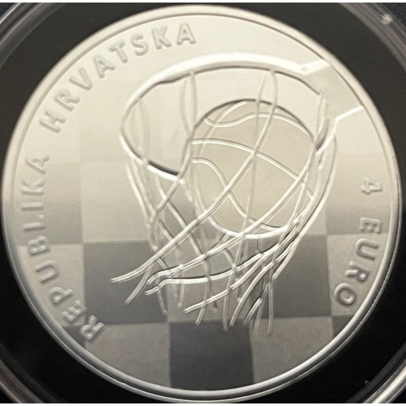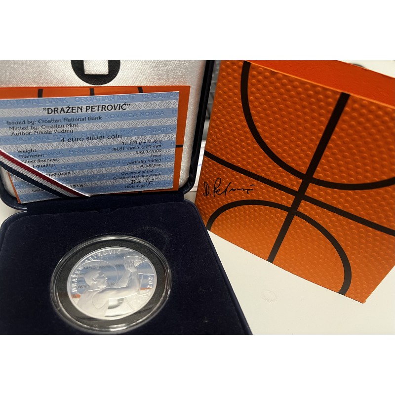 El reverso de la moneda muestra a Dražen en su postura natural de tiro, un disparo que rara vez fallaba y en el que trabajaba incansablemente día y noche. Alrededor del reverso, la inscripción: "DRAŽEN PETROVIĆ" - el nombre de la moneda, y "2024" - el año de emisión. El anverso de la moneda presenta la imagen de un balón de baloncesto atravesando el aro, simbolizando los numerosos éxitos de Dražen en el mundo del baloncesto. Alrededor del anverso, las inscripciones: "REPUBLIKA HRVATSKA" - el país emisor, y "4 EURO" - el valor nominal.