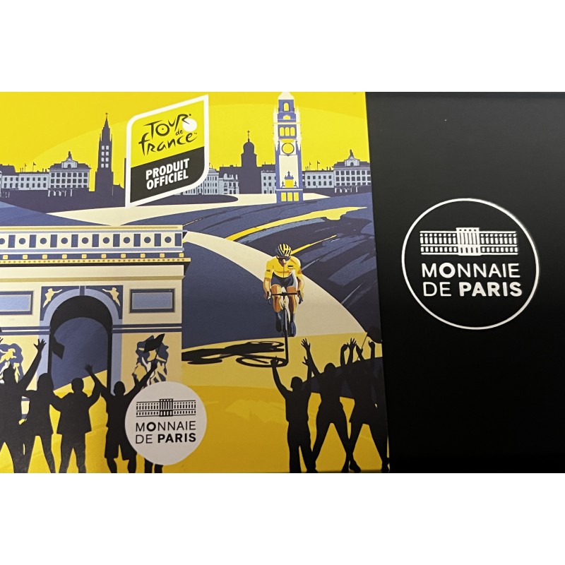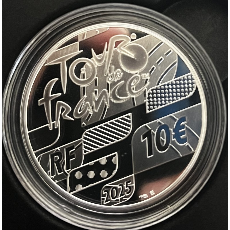 Esta moneda está dedicada a los lugares donde dará comienzo la carrera el próximo 5 de Julio en la ciudad de Lille y su llegada a los Campos Elíseos de París el 27 de julio. El Anverso de la moneda muestra en primer plano a un ciclista pedaleando con energía. Junto a el y en mayúsculas las leyendas "LILLE - "PARIS" - "TOUR DE FRANCE 2025". En un segundo plano y de fondo los radio de una rueda de bicicleta. El Reverso de la moneda, común en la serie, aparecen los cuatro maillots del Tour. El maillot amarillo para el líder de la clasificación general individual, el maillot verde para el líder de la clasificación por puntos, el maillot rojo de lunares para el líder de la clasificación al mejor escalador y; por último, el maillot blanco para el líder de la clasificación juvenil. Las siglas y el logotipo del Tour de France destacan en la parte superior de la monedas junto al valor facial, el año de acuñación y la siglas RF. Moneda 10 Euro en plata 999% con una tirada de 3.000 monedas acompañada de su correspondiente estuche y certificado de autenticidad.